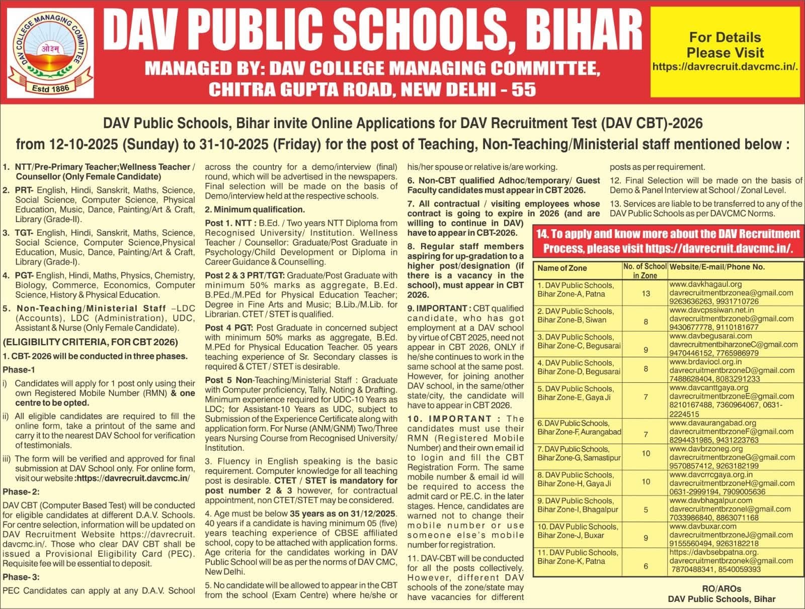 Online Application For Recruitment Test (DAV CBT)- 2026